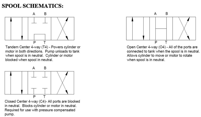 SPOOL TYPE – The spool types we offer are tandem center 4-way (T4), open center 4-way (O4) and closed center 4-way (C4). (See chart and schematics for more information on spool types).
