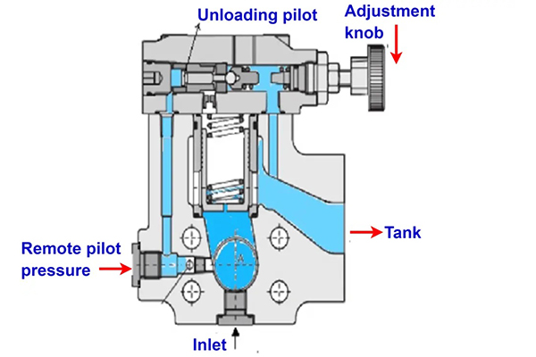The valve uses a pilot stage to sense system pressure and control the main valve. When pressure exceeds the set point, the pilot opens and allows the main valve to release fluid. This design provides stable and accurate pressure control in high-flow and high-pressure systems.
